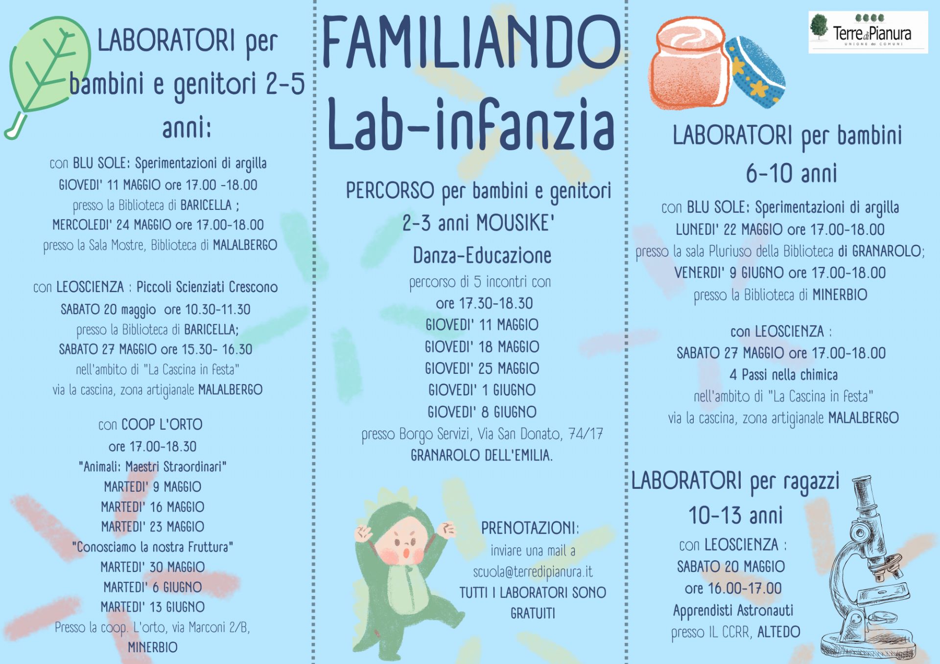 Tutti i laboratori sono gratuiti e per partecipare sarà necessario iscriversi inviando una mail a scuola@terredipianura.it.