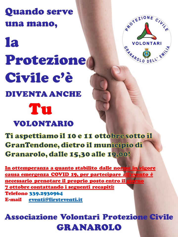 Sabato 10 e domenica 11 Ottobre, dalle 15.30 alle 19.00 sotto il GranTendone installato nell'area verde dietro al Comune, l'associazione "Protezione Civile Granarolo dell'Emilia" presenterà alla cittadinanza l'attività dei volontari della Protezione Civile.