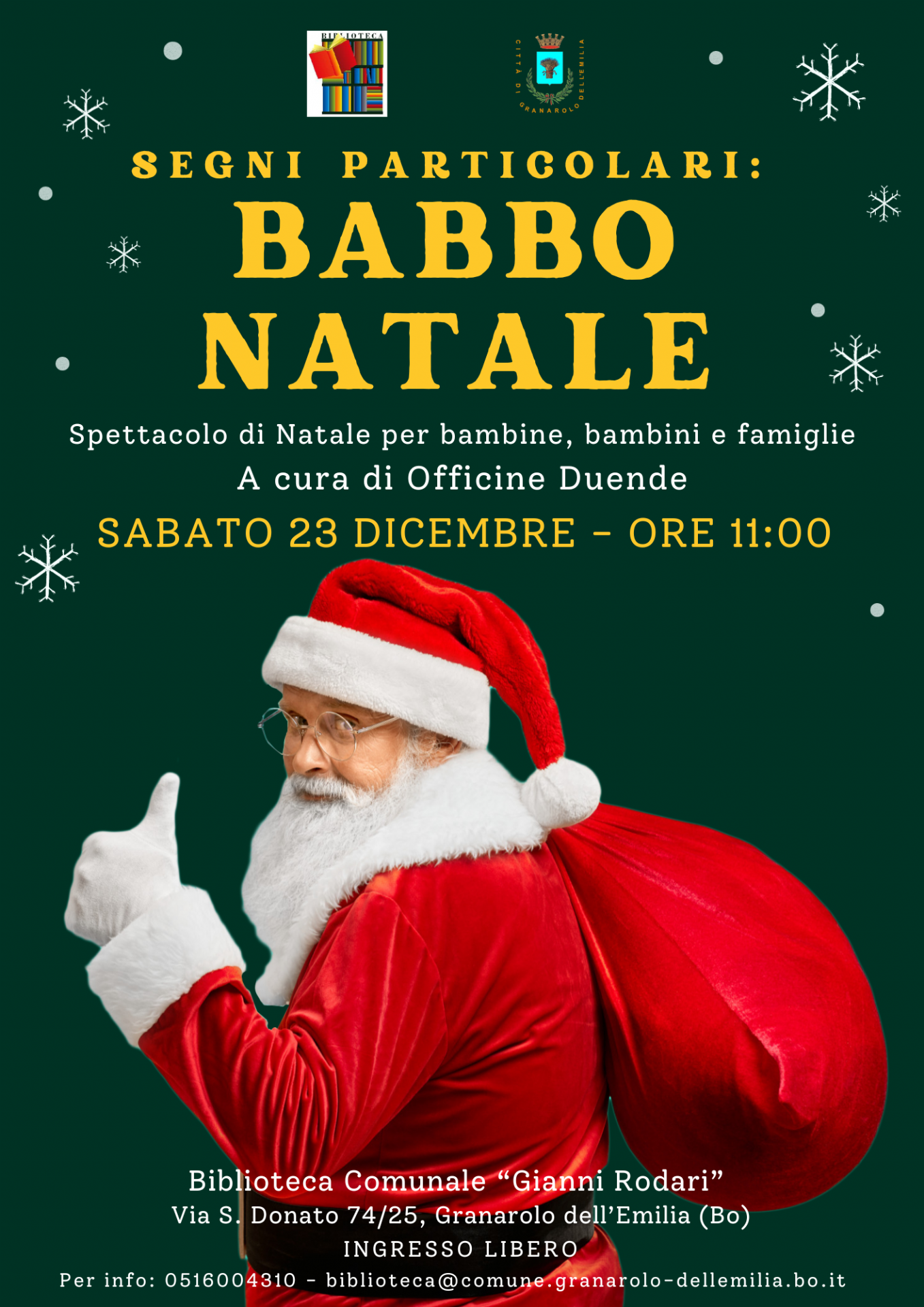 La mattina di sabato 23 dicembre, alle ore 11, spettacolo di Natale in biblioteca comunale a cura di Officine Duende: “Segni particolari: Babbo Natale” farà divertire grandi e piccini.