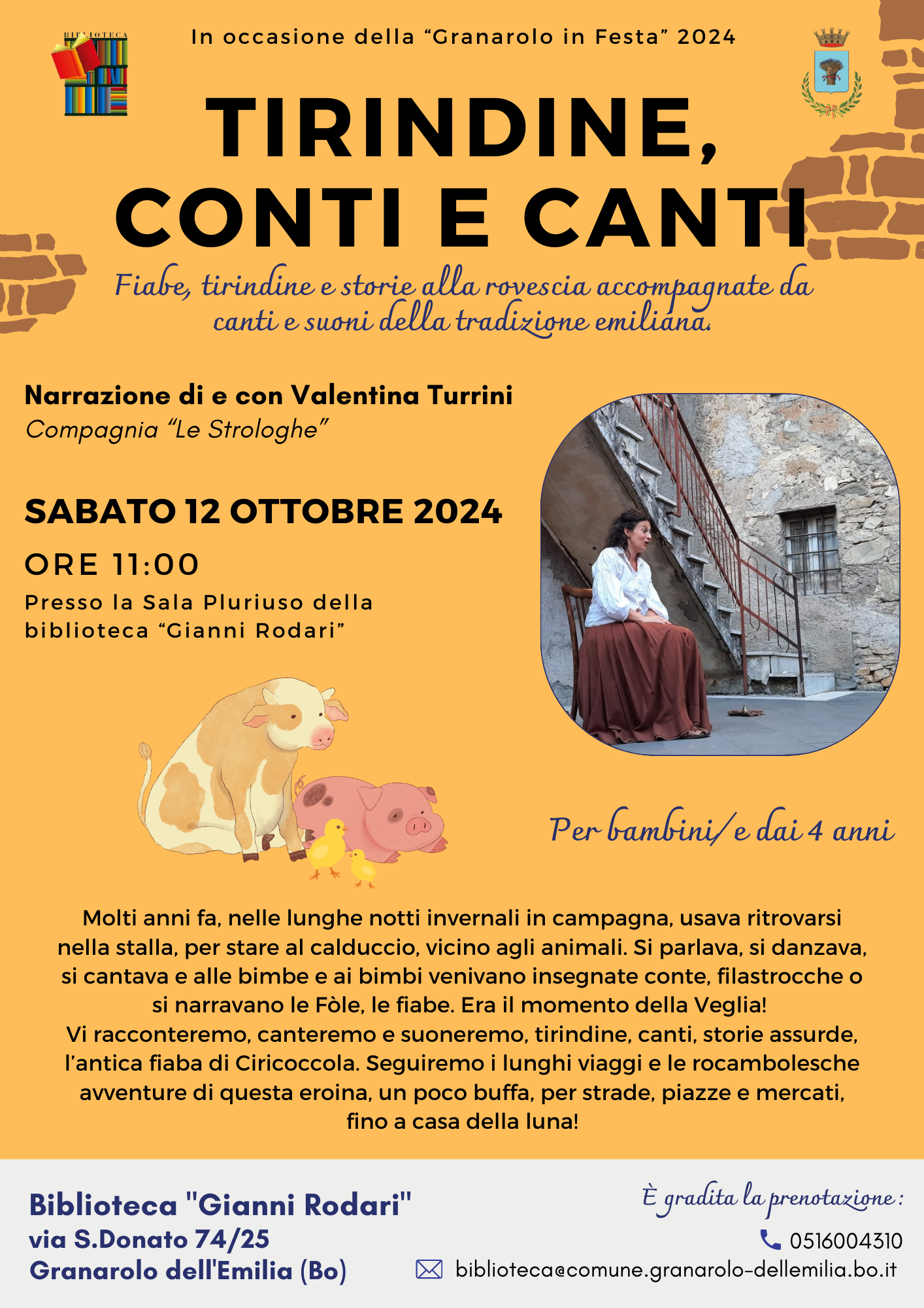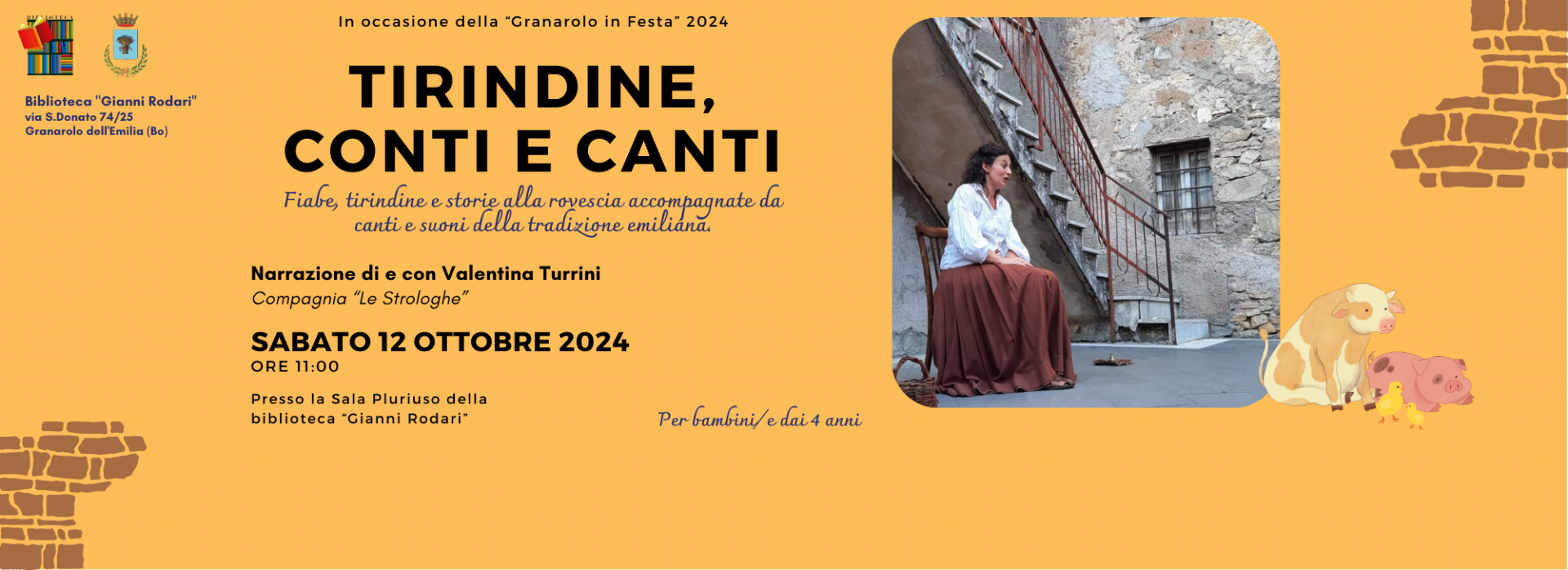 In occasione della “Granarolo in Festa” 2024, sabato 12 ottobre, presso la Sala Pluriuso della Biblioteca "Gianni Rodari", si terrà l'evento "Tirindine, conti e canti", un coinvolgente spettacolo di narrazione per bambini e bambine dai 4 anni in su. La narratrice Valentina Turrini della compagnia "Le Strologhe" guiderà i piccoli spettatori in un viaggio tra fiabe e storie della tradizione emiliana, tra canti e suoni.