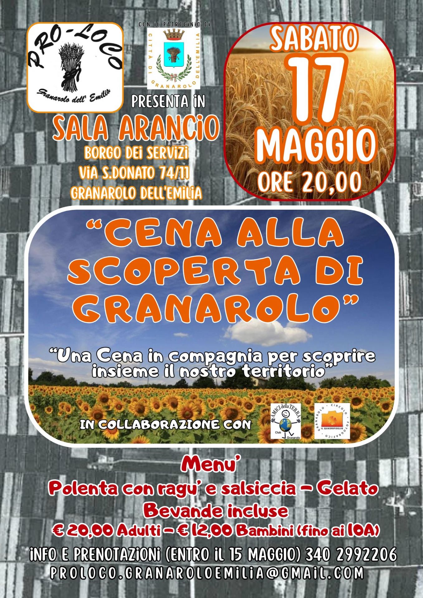 La Pro-Loco di Granarolo dell’Emilia invita tutta la cittadinanza a partecipare alla cena-evento in programma sabato 17 maggio 2025, alle ore 20.00, presso la Sala Arancio presso il Borgo Servizi.