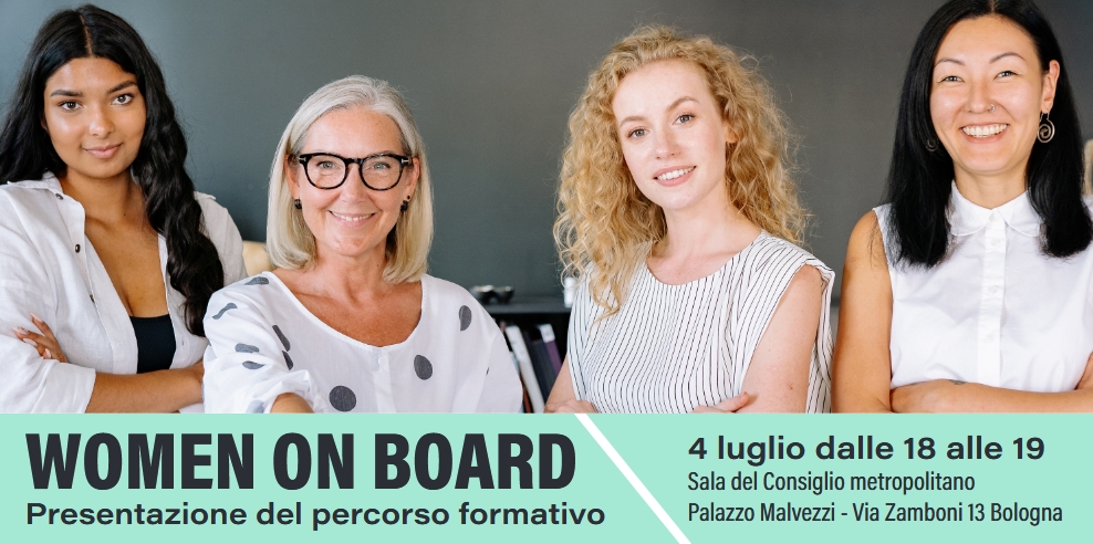Dalle ore 18 alle 19, presso la Sala del Consiglio metropolitano a Palazzo Malvezzi, in via Zamboni 13 a Bologna, si tiene l'evento di presentazione di "WOMEN ON BOARD", progetto rivolto alle donne del territorio per approfondire le competenze necessarie a ricoprire posizioni di responsabilità in aziende e in società pubbliche e private.